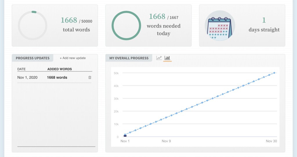 As someone who likes to manage time well, at least sometimes, I love that the power strategy to succeed is to write at least 1,667 words a day. Since I wasn’t 100% confident my head was in the right space to write, I decided to aim for just 1,667 words today. And my opening scene actually ended right at 1,668.